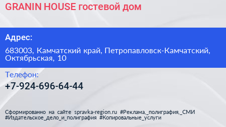 GRANIN HOUSE, гостевой дом по адресу 683003, Камчатский край, Петропавловск-Камчатский, Октябрьская, 10 в дальнейшем Организация, размещена в следующих категориях: