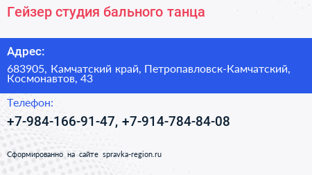 Гейзер, студия бального танца по адресу 683905, Камчатский край, Петропавловск-Камчатский, Космонавтов, 43 в дальнейшем Организация, размещена в следующих категориях: