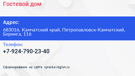 Гостевой дом по адресу 683016, Камчатский край, Петропавловск-Камчатский, Беринга, 116 в дальнейшем Организация, размещена в следующих категориях: