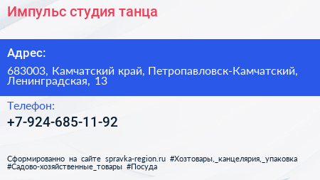 Импульс, студия танца по адресу 683003, Камчатский край, Петропавловск-Камчатский, Ленинградская, 13 в дальнейшем Организация, размещена в следующих категориях: