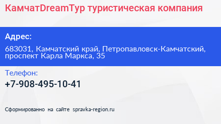 КамчатDreamТур, туристическая компания по адресу 683031, Камчатский край, Петропавловск-Камчатский, проспект Карла Маркса, 35 в дальнейшем Организация, размещена в следующих категориях: