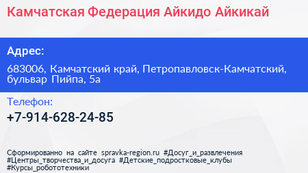 Камчатская Федерация Айкидо Айкикай по адресу 683006, Камчатский край, Петропавловск-Камчатский, бульвар Пийпа, 5а в дальнейшем Организация, размещена в следующих категориях: