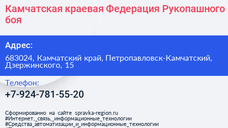 Камчатская краевая Федерация Рукопашного боя по адресу 683024, Камчатский край, Петропавловск-Камчатский, Дзержинского, 15 в дальнейшем Организация, размещена в следующих категориях: