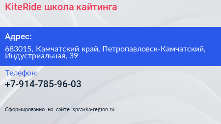 KiteRide, школа кайтинга по адресу 683015, Камчатский край, Петропавловск-Камчатский, Индустриальная, 39 в дальнейшем Организация, размещена в следующих категориях: