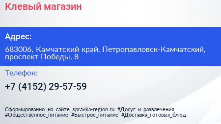Клевый, магазин по адресу 683006, Камчатский край, Петропавловск-Камчатский, проспект Победы, 8 в дальнейшем Организация, размещена в следующих категориях: