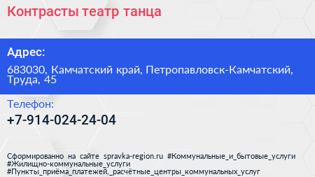 Контрасты, театр танца по адресу 683030, Камчатский край, Петропавловск-Камчатский, Труда, 45 в дальнейшем Организация, размещена в следующих категориях: