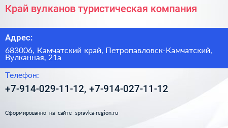 Край вулканов, туристическая компания по адресу 683006, Камчатский край, Петропавловск-Камчатский, Вулканная, 21а в дальнейшем Организация, размещена в следующих категориях: