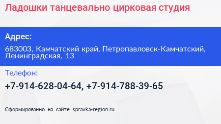 Ладошки, танцевально-цирковая студия по адресу 683003, Камчатский край, Петропавловск-Камчатский, Ленинградская, 13 в дальнейшем Организация, размещена в следующих категориях: