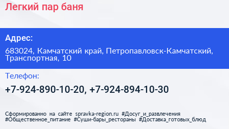Легкий пар, баня по адресу 683024, Камчатский край, Петропавловск-Камчатский, Транспортная, 10 в дальнейшем Организация, размещена в следующих категориях: