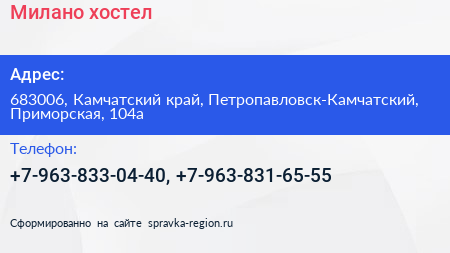 Милано, хостел по адресу 683006, Камчатский край, Петропавловск-Камчатский, Приморская, 104а в дальнейшем Организация, размещена в следующих категориях: