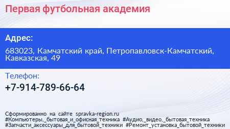 Первая футбольная академия по адресу 683023, Камчатский край, Петропавловск-Камчатский, Кавказская, 49 в дальнейшем Организация, размещена в следующих категориях: