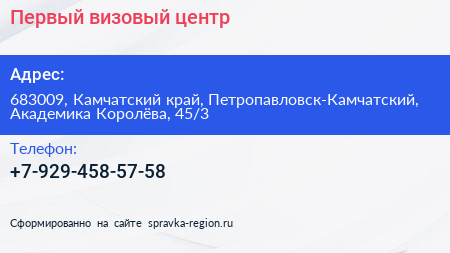 Первый визовый центр по адресу 683009, Камчатский край, Петропавловск-Камчатский, Академика Королёва, 45/3 в дальнейшем Организация, размещена в следующих категориях: