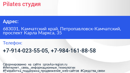 Pilates, студия по адресу 683031, Камчатский край, Петропавловск-Камчатский, проспект Карла Маркса, 35 в дальнейшем Организация, размещена в следующих категориях: