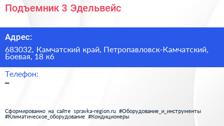Подъемник №3, Эдельвейс по адресу 683032, Камчатский край, Петропавловск-Камчатский, Боевая, 18 к6 в дальнейшем Организация, размещена в следующих категориях: