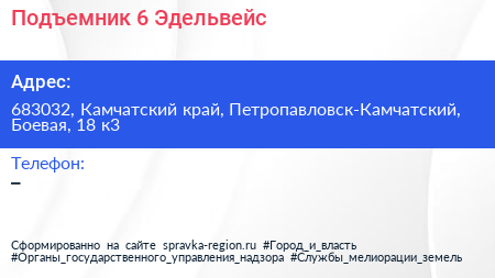 Подъемник №6, Эдельвейс по адресу 683032, Камчатский край, Петропавловск-Камчатский, Боевая, 18 к3 в дальнейшем Организация, размещена в следующих категориях: