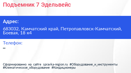 Подъемник №7, Эдельвейс по адресу 683032, Камчатский край, Петропавловск-Камчатский, Боевая, 18 к4 в дальнейшем Организация, размещена в следующих категориях: