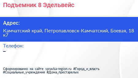 Подъемник №8, Эдельвейс по адресу Камчатский край, Петропавловск-Камчатский, Боевая, 18 к7 в дальнейшем Организация, размещена в следующих категориях: