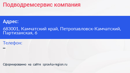 Подводремсервис, компания по адресу 683001, Камчатский край, Петропавловск-Камчатский, Партизанская, 6 в дальнейшем Организация, размещена в следующих категориях: