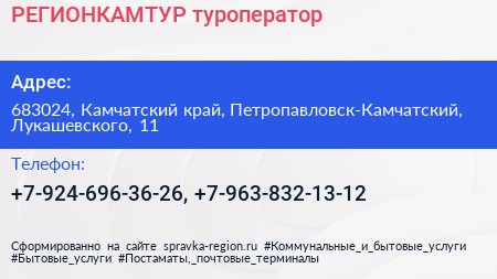 РЕГИОНКАМТУР, туроператор по адресу 683024, Камчатский край, Петропавловск-Камчатский, Лукашевского, 11 в дальнейшем Организация, размещена в следующих категориях: