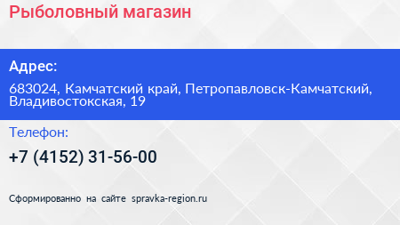 Рыболовный, магазин по адресу 683024, Камчатский край, Петропавловск-Камчатский, Владивостокская, 19 в дальнейшем Организация, размещена в следующих категориях: