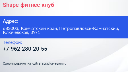 Shape, фитнес-клуб по адресу 683003, Камчатский край, Петропавловск-Камчатский, Ключевская, 39/1 в дальнейшем Организация, размещена в следующих категориях: