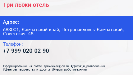 Три лыжи, отель по адресу 683001, Камчатский край, Петропавловск-Камчатский, Советская, 48 в дальнейшем Организация, размещена в следующих категориях: