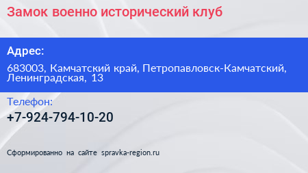 Замок, военно-исторический клуб по адресу 683003, Камчатский край, Петропавловск-Камчатский, Ленинградская, 13 в дальнейшем Организация, размещена в следующих категориях: