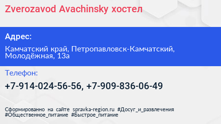 Zverozavod Avachinsky, хостел по адресу Камчатский край, Петропавловск-Камчатский, Молодёжная, 13а в дальнейшем Организация, размещена в следующих категориях: