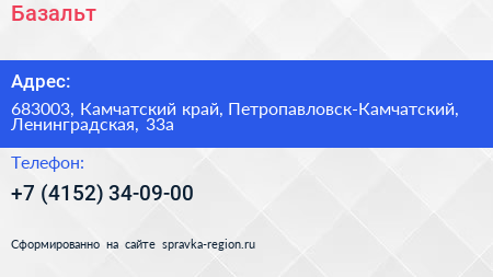 Базальт по адресу 683003, Камчатский край, Петропавловск-Камчатский, Ленинградская, 33а в дальнейшем Организация, размещена в следующих категориях: