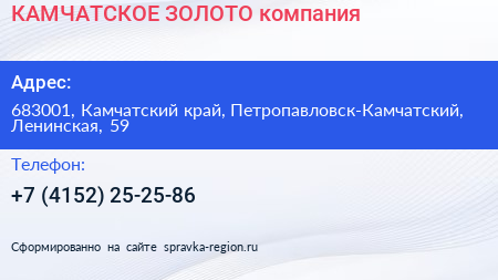 КАМЧАТСКОЕ ЗОЛОТО, компания по адресу 683001, Камчатский край, Петропавловск-Камчатский, Ленинская, 59 в дальнейшем Организация, размещена в следующих категориях:
