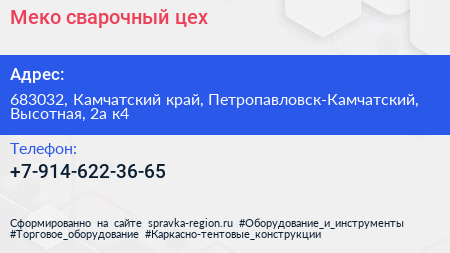 Меко, сварочный цех по адресу 683032, Камчатский край, Петропавловск-Камчатский, Высотная, 2а к4 в дальнейшем Организация, размещена в следующих категориях:
