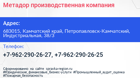 Метадор, производственная компания по адресу 683015, Камчатский край, Петропавловск-Камчатский, Индустриальная, 38/3 в дальнейшем Организация, размещена в следующих категориях: