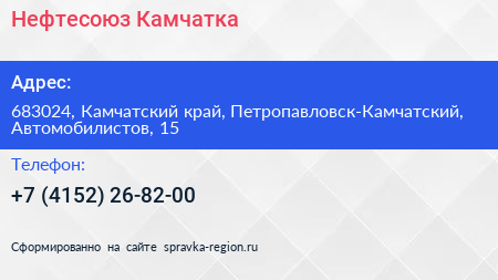 Нефтесоюз Камчатка по адресу 683024, Камчатский край, Петропавловск-Камчатский, Автомобилистов, 15 в дальнейшем Организация, размещена в следующих категориях: