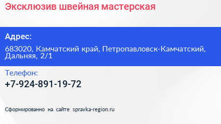 Эксклюзив, швейная мастерская по адресу 683020, Камчатский край, Петропавловск-Камчатский, Дальняя, 2/1 в дальнейшем Организация, размещена в следующих категориях: