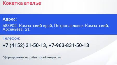 Кокетка, ателье по адресу 683902, Камчатский край, Петропавловск-Камчатский, Арсеньева, 21 в дальнейшем Организация, размещена в следующих категориях: