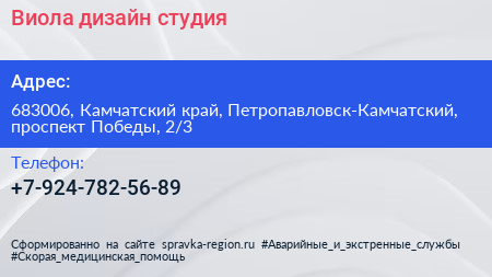 Виола, дизайн-студия по адресу 683006, Камчатский край, Петропавловск-Камчатский, проспект Победы, 2/3 в дальнейшем Организация, размещена в следующих категориях:
