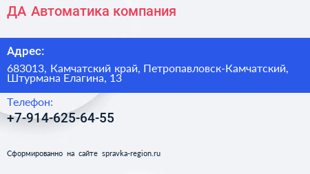 ДА-Автоматика, компания по адресу 683013, Камчатский край, Петропавловск-Камчатский, Штурмана Елагина, 13 в дальнейшем Организация, размещена в следующих категориях: