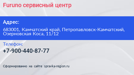 Furuno, сервисный центр по адресу 683001, Камчатский край, Петропавловск-Камчатский, Озерновская Коса, 11/12 в дальнейшем Организация, размещена в следующих категориях: