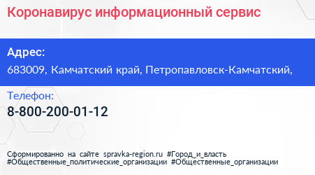 Коронавирус, информационный сервис по адресу 683009, Камчатский край, Петропавловск-Камчатский, в дальнейшем Организация, размещена в следующих категориях: