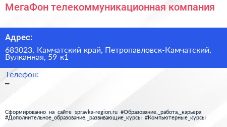 МегаФон, телекоммуникационная компания по адресу 683023, Камчатский край, Петропавловск-Камчатский, Вулканная, 59 к1 в дальнейшем Организация, размещена в следующих категориях: