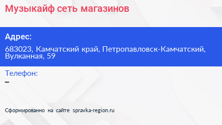 Музыкайф, сеть магазинов по адресу 683023, Камчатский край, Петропавловск-Камчатский, Вулканная, 59 в дальнейшем Организация, размещена в следующих категориях: