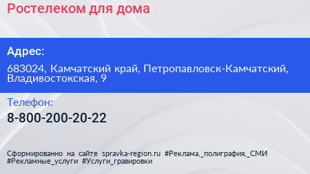 Ростелеком для дома по адресу 683024, Камчатский край, Петропавловск-Камчатский, Владивостокская, 9 в дальнейшем Организация, размещена в следующих категориях: