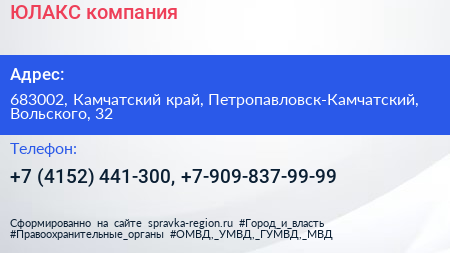 ЮЛАКС, компания по адресу 683002, Камчатский край, Петропавловск-Камчатский, Вольского, 32 в дальнейшем Организация, размещена в следующих категориях: