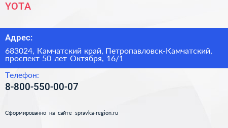YOTA по адресу 683024, Камчатский край, Петропавловск-Камчатский, проспект 50 лет Октября, 16/1 в дальнейшем Организация, размещена в следующих категориях: