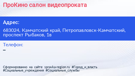 ПроКино, салон видеопроката по адресу 683024, Камчатский край, Петропавловск-Камчатский, проспект Рыбаков, 1в в дальнейшем Организация, размещена в следующих категориях: