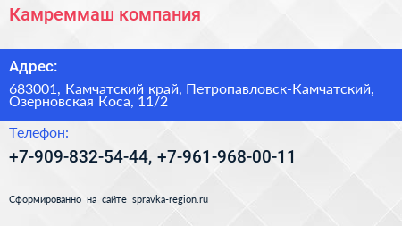 Камреммаш, компания по адресу 683001, Камчатский край, Петропавловск-Камчатский, Озерновская Коса, 11/2 в дальнейшем Организация, размещена в следующих категориях: