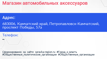 Магазин автомобильных аксессуаров по адресу 683006, Камчатский край, Петропавловск-Камчатский, проспект Победы, 57а в дальнейшем Организация, размещена в следующих категориях: