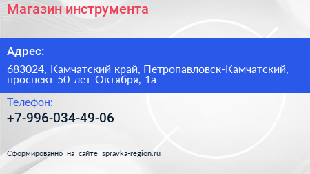 Магазин инструмента по адресу 683024, Камчатский край, Петропавловск-Камчатский, проспект 50 лет Октября, 1а в дальнейшем Организация, размещена в следующих категориях: