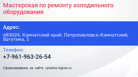 Мастерская по ремонту холодильного оборудования по адресу 683024, Камчатский край, Петропавловск-Камчатский, Ватутина, 1 в дальнейшем Организация, размещена в следующих категориях: