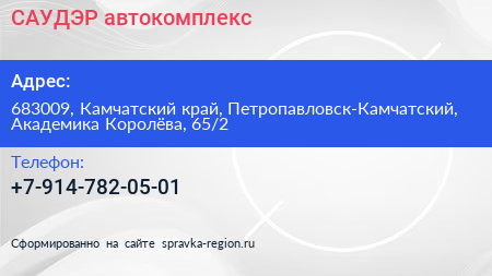 САУДЭР, автокомплекс по адресу 683009, Камчатский край, Петропавловск-Камчатский, Академика Королёва, 65/2 в дальнейшем Организация, размещена в следующих категориях: